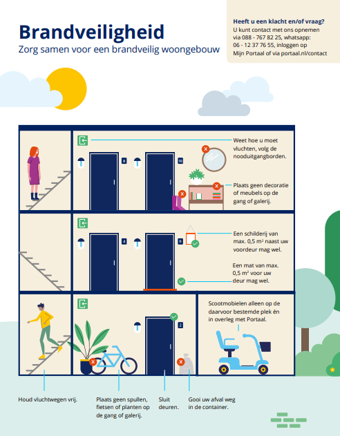- Zorg dat er geen spullen staan in de hal, het trappenhuis, de lift, de galerij of op de gang. Dan kan iedereen snel vluchten bij brand.