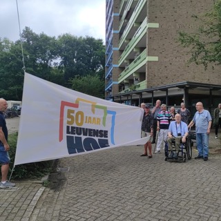 Afgelopen vrijdag 25 juli vierde wooncomplex Leuvensehof van Portaal een bijzonder moment: het gebouw bestaat precies 50 jaar. Dit jubileum werd gevierd met een kleine, warme bijeenkomst met bewoners, koffie, gebak en een bijzonder moment: het hijsen van een eigen vlag. Franz en Dirk wonen er sinds het begin en vertellen hun verhaal.