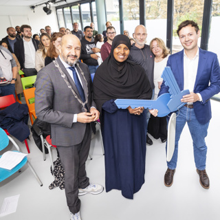 Gisteren ontvingen bewoners van Portaal die hun woning verloren door de brand aan de Van Kinsbergenstraat de sleutel van hun nieuwe huis.