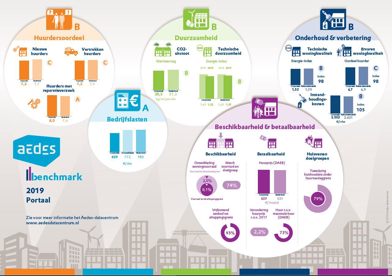 De Aedes-benchmark bestaat uit vijf prestatievelden: Huurdersoordeel, Bedrijfslasten, Duurzaamheid, Onderhoud & verbetering en Beschikbaarheid & betaalbaarheid. Dit jaar is de verdieping Nieuwbouw toegevoegd (geen prestatieveld). Deze geven op hoofdlijnen een totaalbeeld over het presteren van individuele corporaties en de gehele sector. De benchmark biedt gemeenten, huurders en andere belanghebbenden inzicht in hoe corporaties hun middelen besteden.