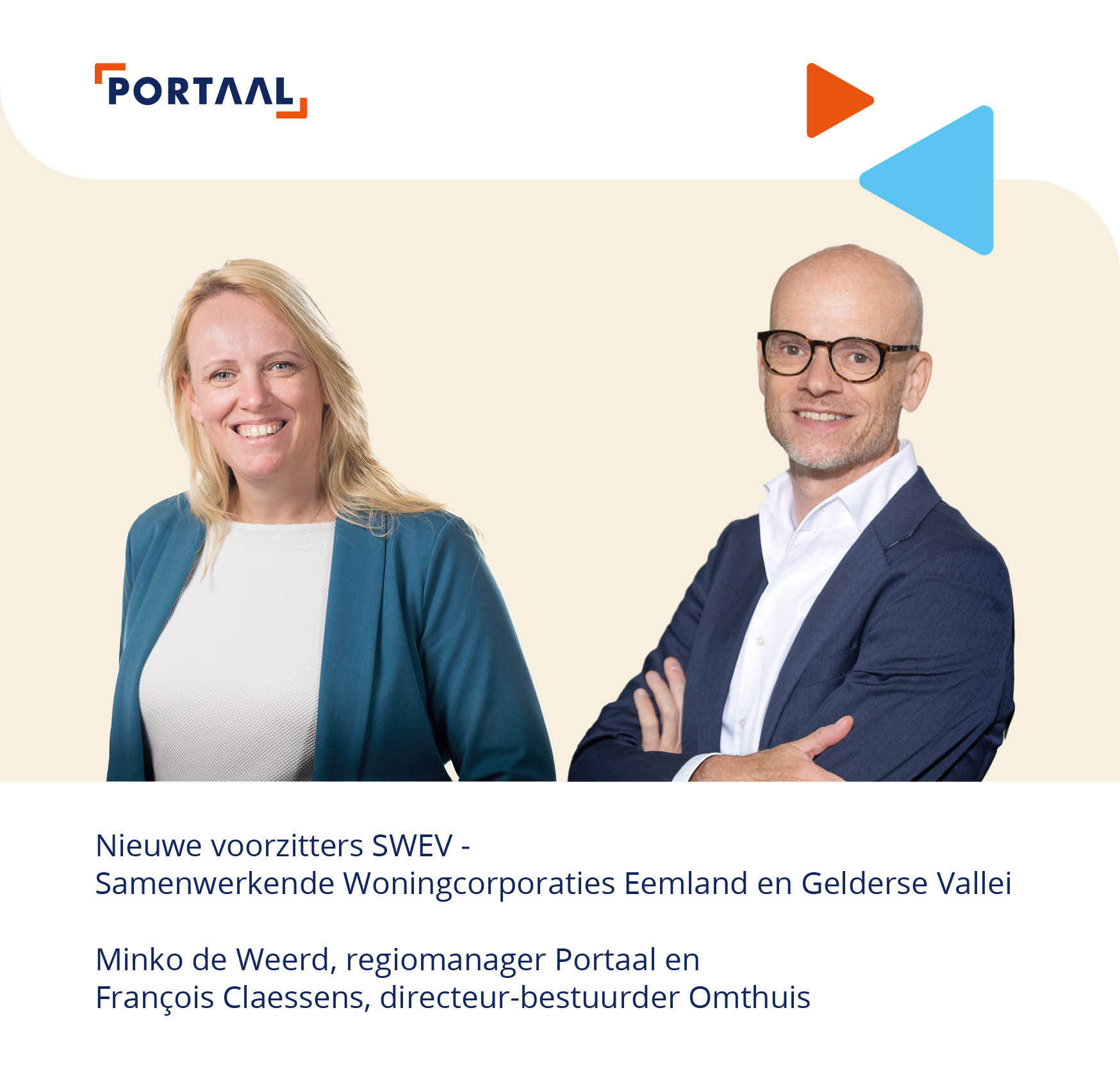 Op 1 april 2025 vindt er een voorzitterswissel plaats bij de SWEV, de Samenwerkende Woningcorporaties Eemland en Gelderse Vallei. Peter Toonen (directeur-bestuurder Omnia Wonen) en Joan van der Burgt (directeur regio Amersfoort, De Alliantie) dragen het voorzitterschap over aan Minko de Weerd (regiomanager Eemland, Portaal) en François Claessens (directeur bestuurder Omthuis).